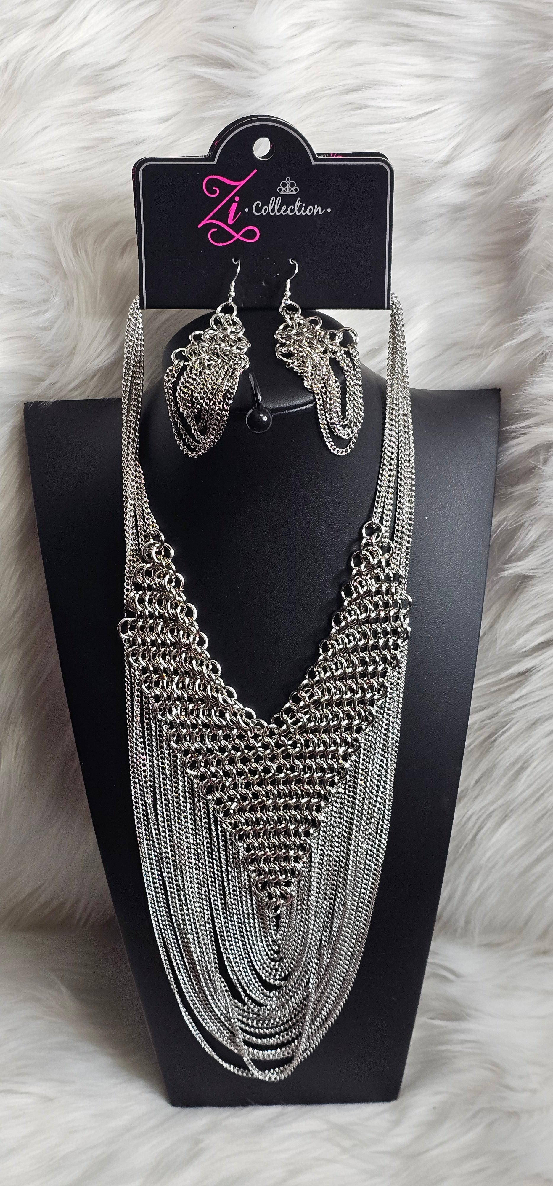Paparazzi Accessories Defiant - 2020 Zi Collection Necklaces suspended from the bottom of thickly layered chains, a rebellious mesh of silver links connect into an edgy V-shaped net. Tiers of dainty silver chains drape from the bottom of the net, creating radically layered shimmer across the chest. Features an adjustable clasp closure.