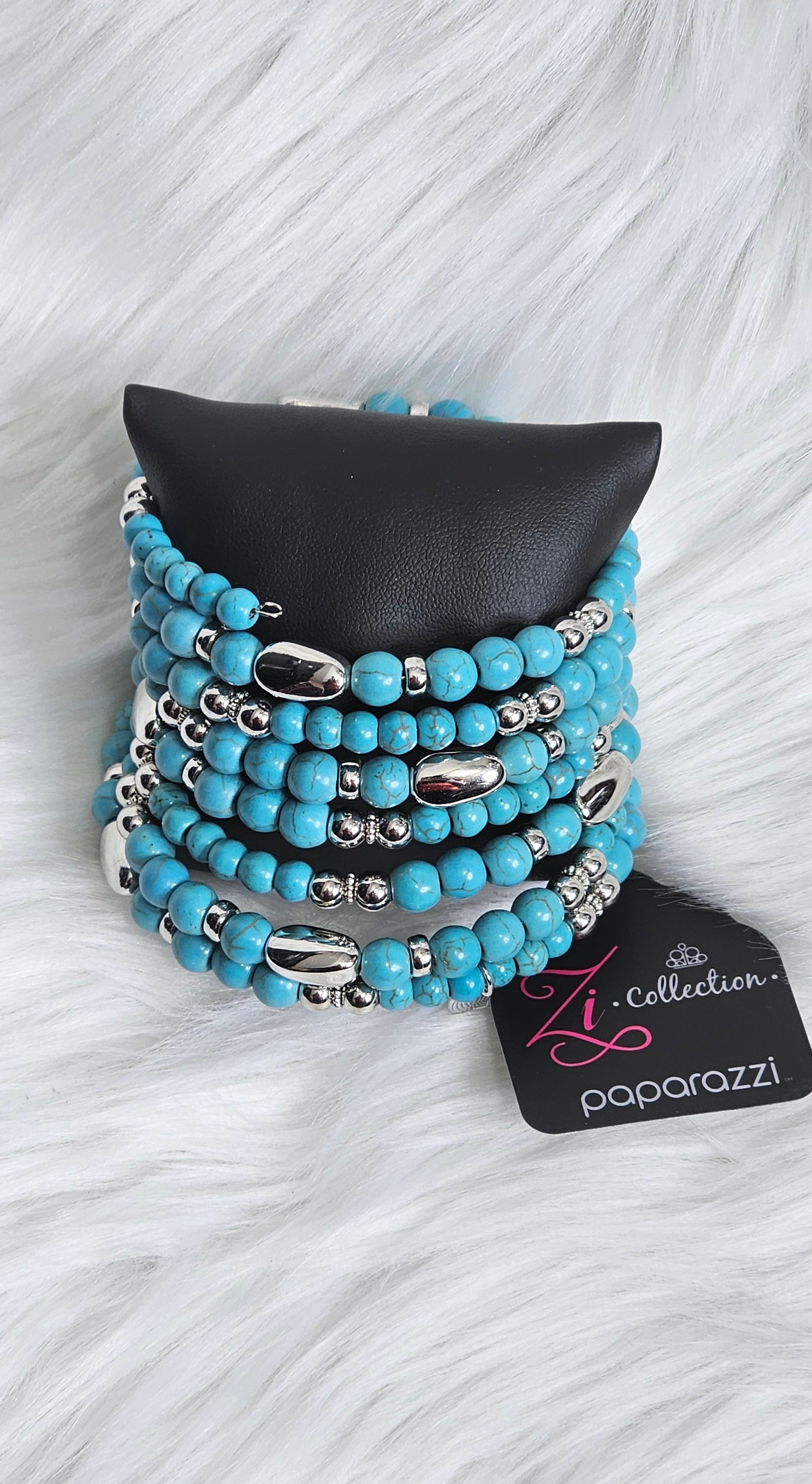 An artisanal assortment of mismatched turquoise stones and silver accents are threaded along a dainty wire that infinitely coils around the wrist, creating glamorously groundbreaking layers.
