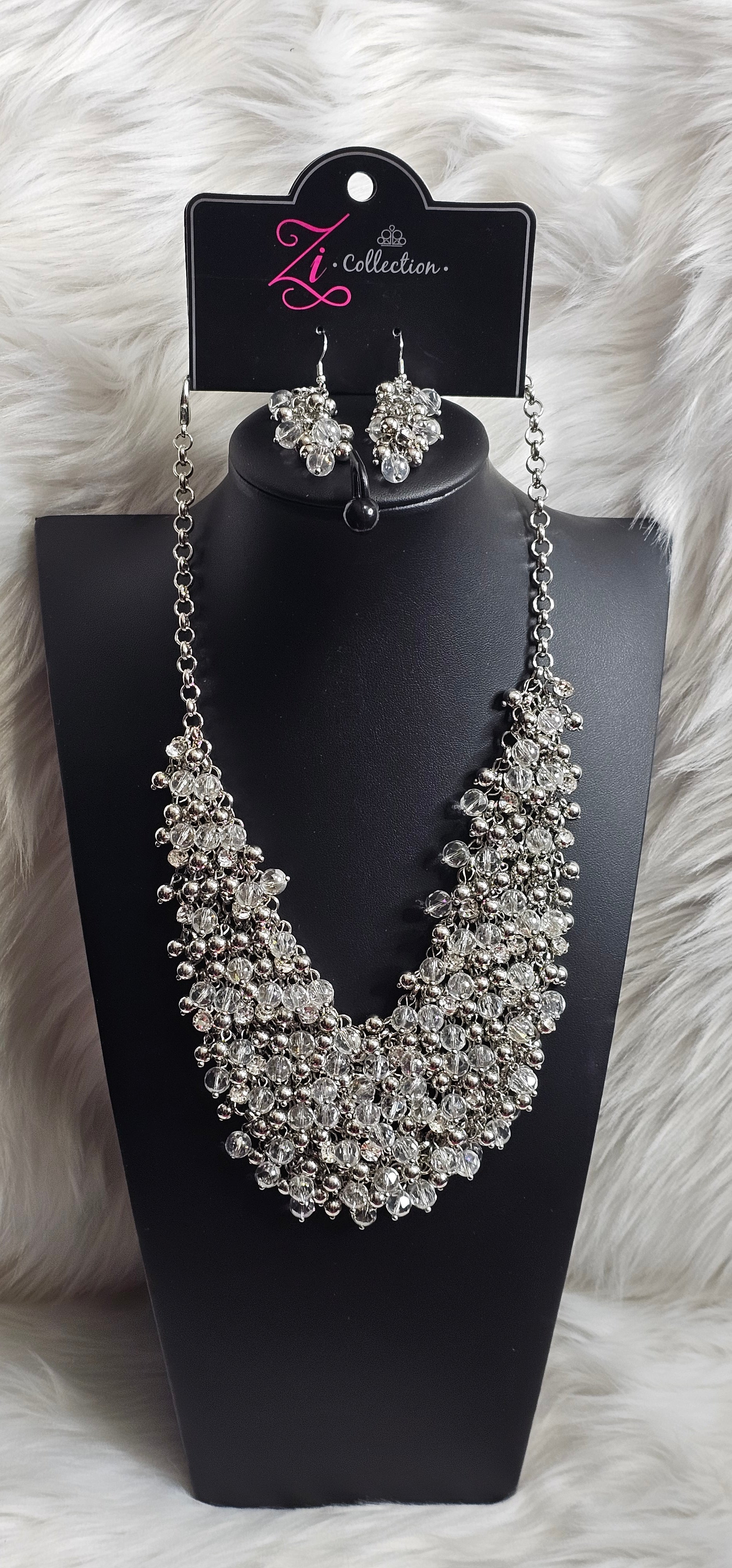 Paparazzi Accessories Sociable - Zi Collection Necklaces a seemingly infinite collection of bubbly silver beads, glittery white rhinestones, and glassy iridescent beads swings from an interconnected net of silver links. The flirtatious fringe effervescently dances below the collar, creating a noise-making statement piece. Features an adjustable clasp closure.