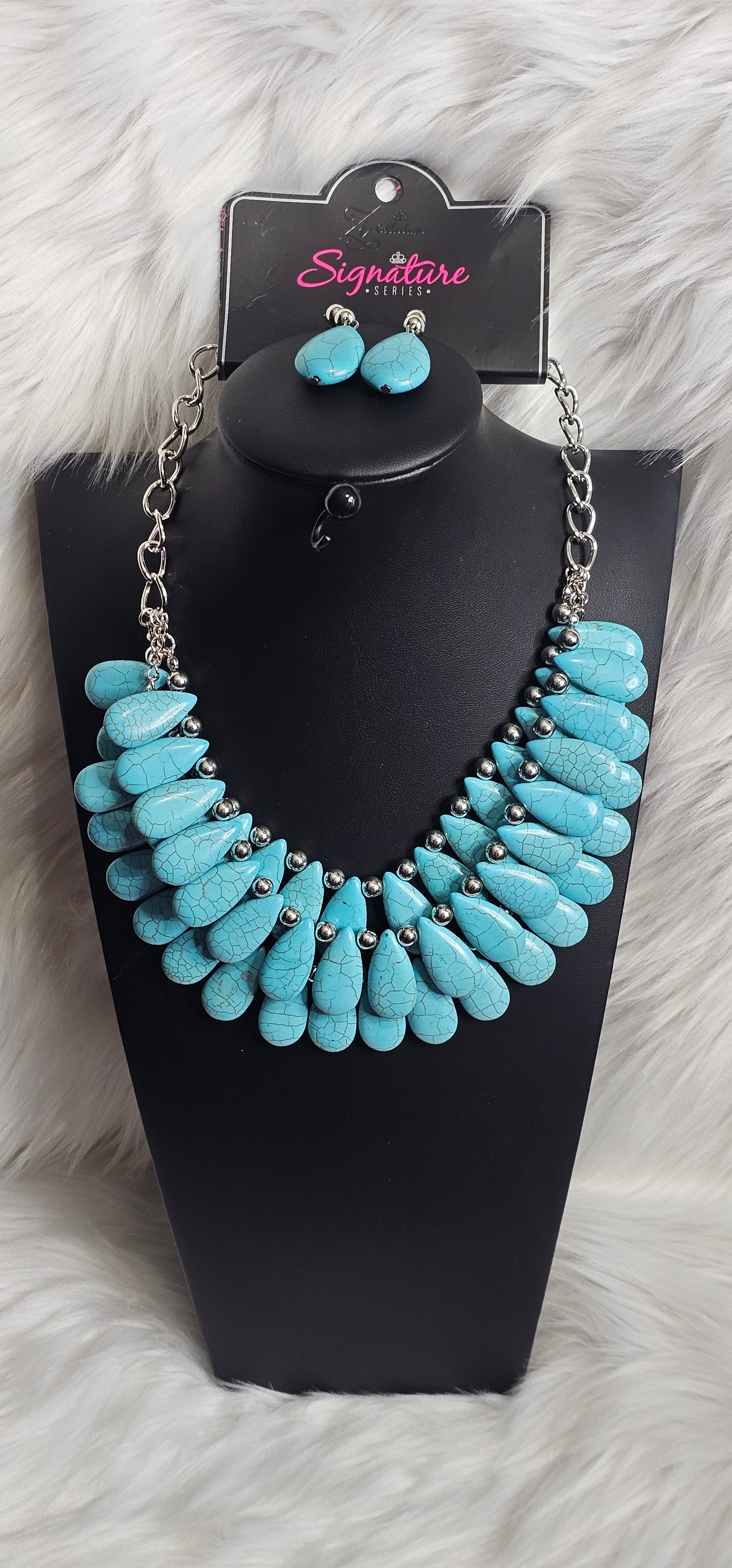 Paparazzi Accessories The Amy 2020 Zi Collection Necklaces three trailblazing tiers of shiny silver beads and turquoise teardrops fearlessly cascade into a bold tribal inspired fringe below the collar. Attached to a chunky silver chain, the groundbreaking stone compilation delicately layers into an earth-rattling statement-maker. Features an adjustable clasp closure.