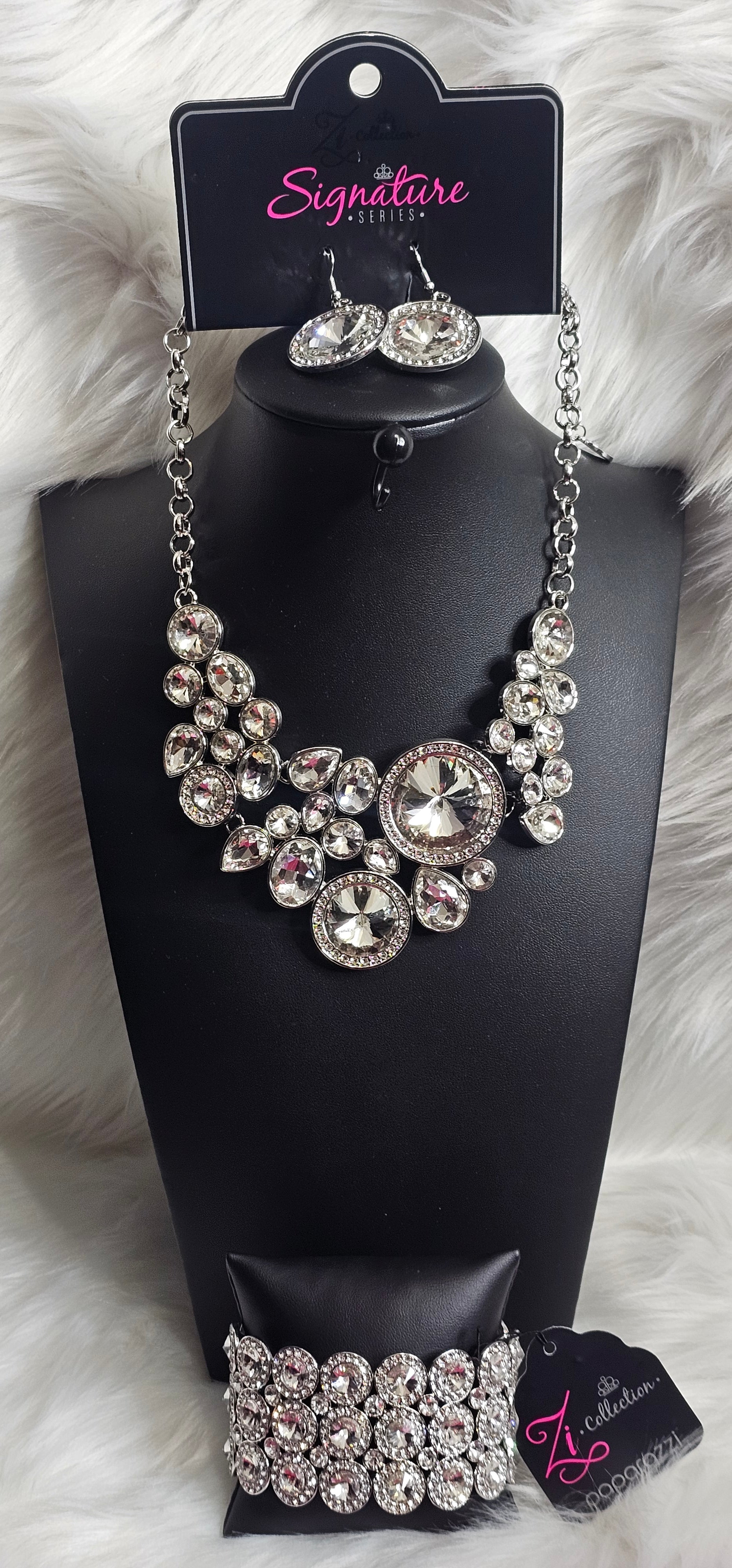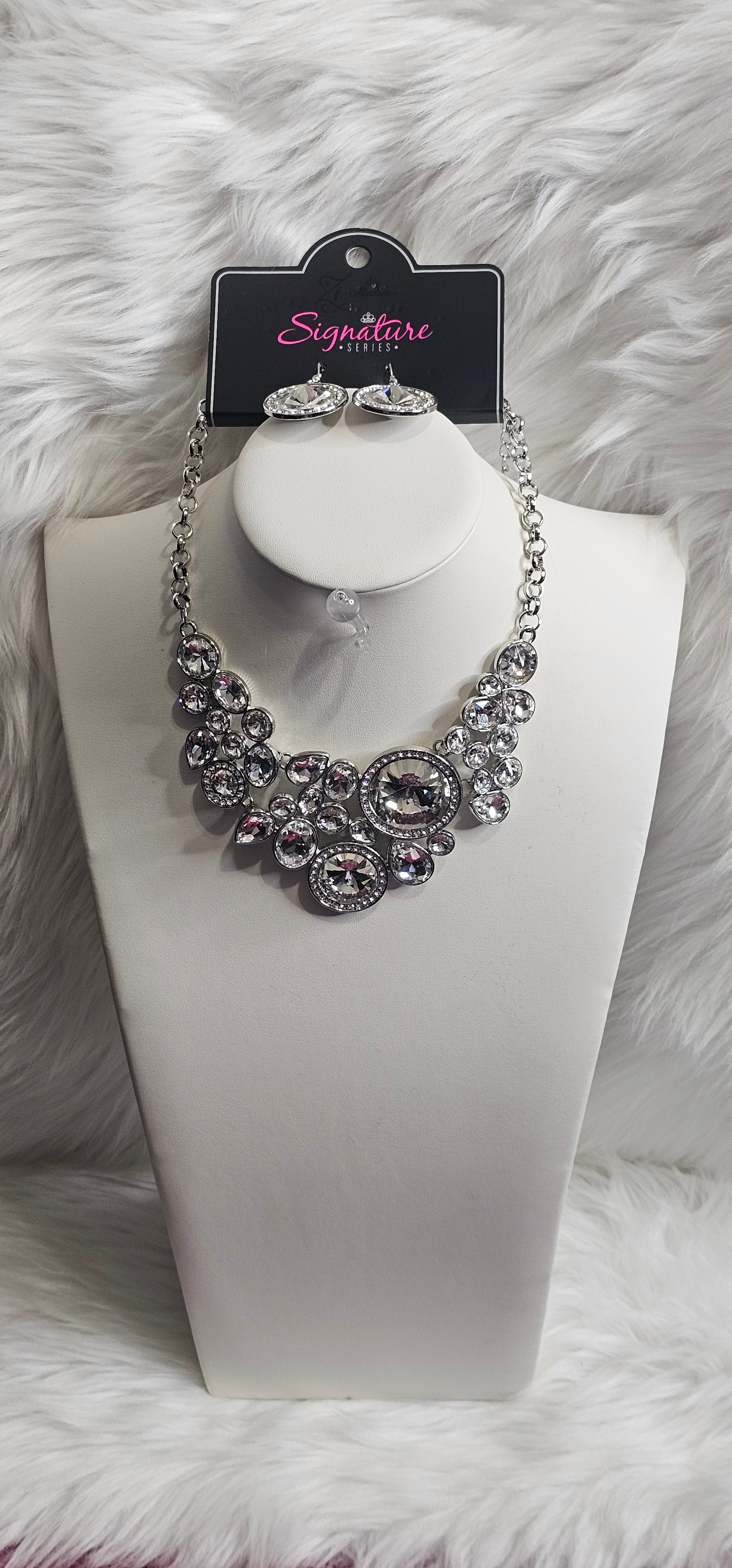Featuring an oversized collection of round, oval, and teardrop white rhinestones, an exaggerated explosion of dynamite dazzle coalesces into three separate frames below the collar. The combustible frames flawlessly link into a mismatched arrangement of legendary sparkle. Features an adjustable clasp closure.