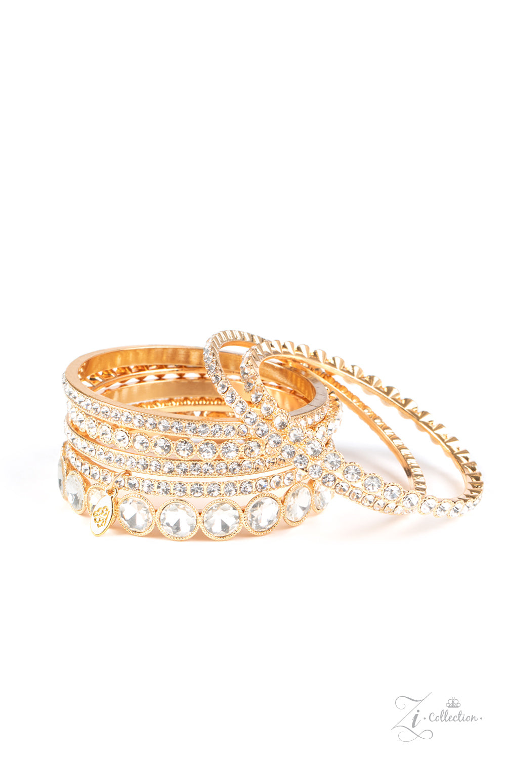 oversized collection of glittery white rhinestones are encrusted across the front of elegantly mismatched gold bangles. The blinding collection stacks and slides across the wrist, creating spellbinding sparkle with just a flick of the wrist.