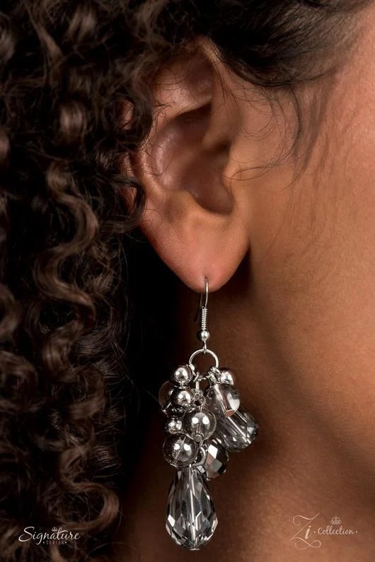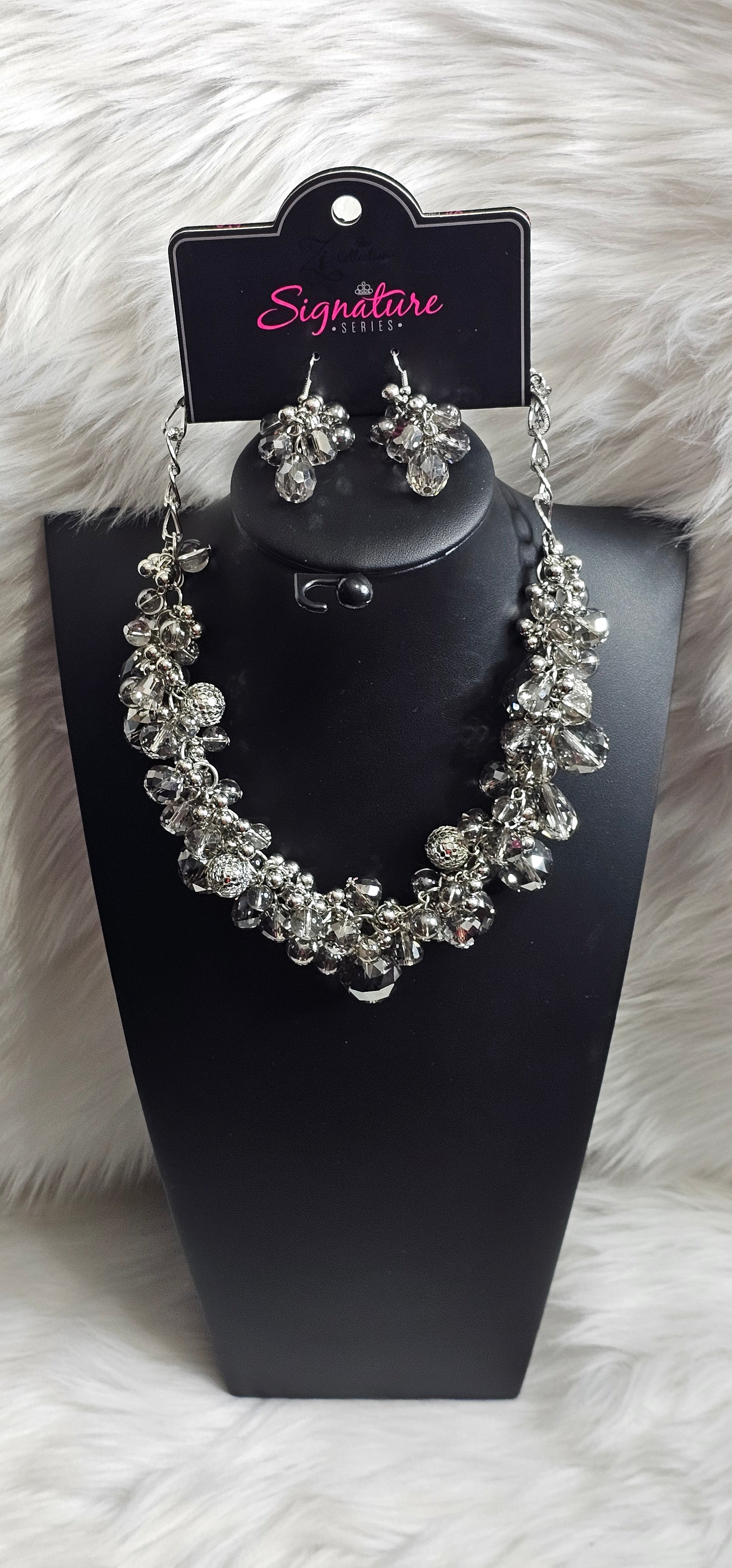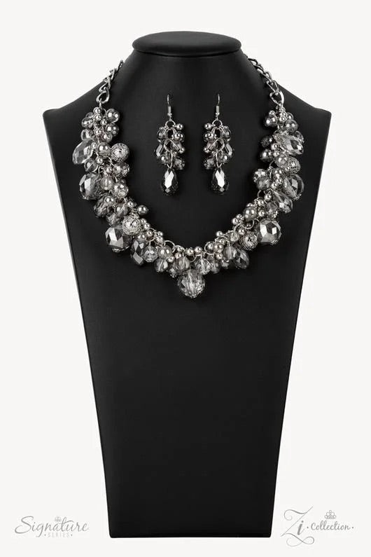 Elegantly enhanced with classic silver and silvery wire mesh beads, a glassy glamorous collection of majestically mismatched smoky crystal-like beads capriciously cluster along a bold silver chain below the collar. Each fabulously faceted crystal refracts the light, adding audible sparkle to this thunderous statement. Features an adjustable clasp closure.